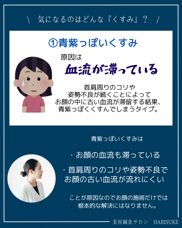 血流が滞ることで顔の中に古い血液が停滞し、青紫っぽくくすんだ印象になってしまいます。